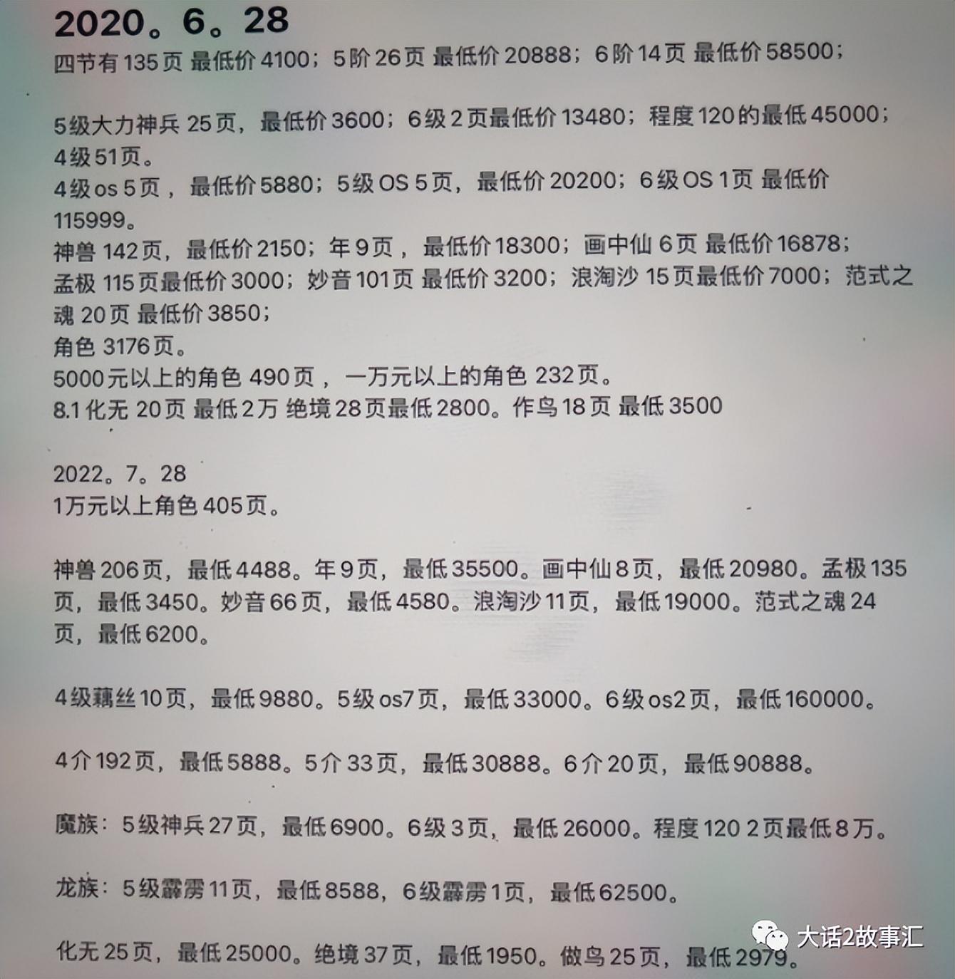 然而还是有较真的玩家统计了2020年和2022年几乎同期的藏宝阁数据。大家可以详细对比这两年的物品价格以及货物数量。这些数据的一个表象总结就是:库存量变多了,价格反而还在短时间内(2年)直接翻了一倍。明显违背了正常的供需关系理论,难道通货膨胀能合理解释这个问题?
