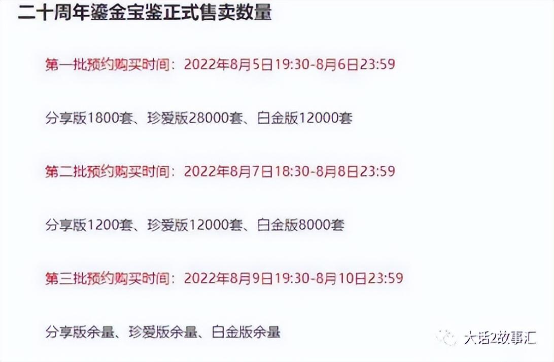今天咱们继续对比另一组数据。去年惜红衣的数量55800和今年心猿的数量63000。2021年的鎏金宝鉴和2022年的投放差异也能看出开发组的一些营收策略。本以为今年20周年,平民能接受的版本发行量会多一些,结果珍爱版少了,白金版多了,开发组的吃相还是一如既往的的明显。对于平民玩家而言福利是不太可能有的了。