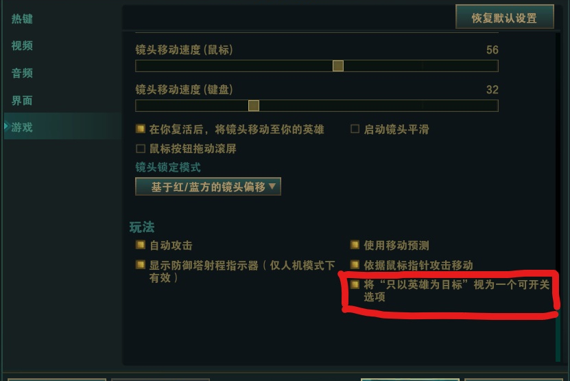 启动方式:在游戏中按下“Esc”键,弹出“选项“面板。选择“游戏”一栏,在游戏栏的“玩法”中,单击将”只以英雄为目标“打开,单击确定按钮保存设置。在键盘上单击“~”即可开启。