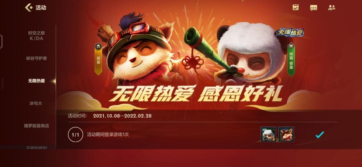 然后就是简单粗暴的无限热爱活动,登录就可以领取提莫的英雄与其配套的熊猫皮肤,英雄池中再次增加一位!在开服的赏金计划活动中,只需要每天签到一下,三天后即可免费领取赏金猎人厄运小姐,作为一名人气射手,强度在英雄联盟手游中是相当不错!不删档开启活动也会为我们赠送一个英雄,不过这个英雄是五选一,大家需要在娜美、蕾欧娜、索拉卡、娑娜以及赛娜中选择,推荐大家选择蕾欧娜,强度非常高!