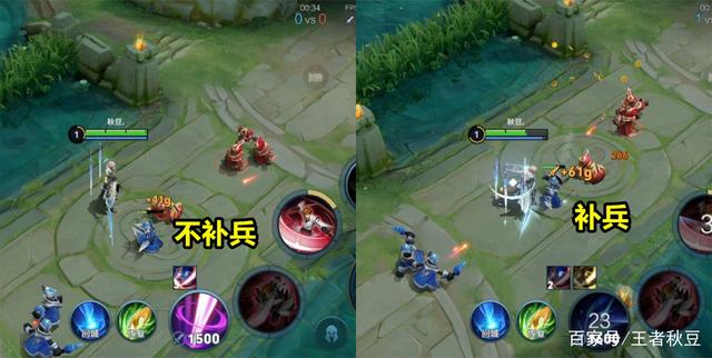 可以看到,不补兵金币仅41,补兵金币变成61,补兵金币多了约33%,一波三个兵线就约多60金币。按照每波兵线刷新时间33秒,10分钟补兵和补兵经济就相差约1200金币,这已经相当于大半件装备。