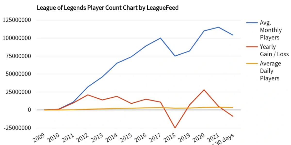 而事实上,英雄联盟的玩家总数在近几年来不仅没有下降,反而在逐渐上升当中,从09年游戏上线开始,只有17到18年这个阶段英雄联盟玩家人数出现跌停,而且是暴跌,除此之外便是21年的跌落,其余部分全都是在稳定增长当中,而17年和21年玩家总数跌落的原因其实也非常好解释,其分别是由于外部冲击和内部改革。