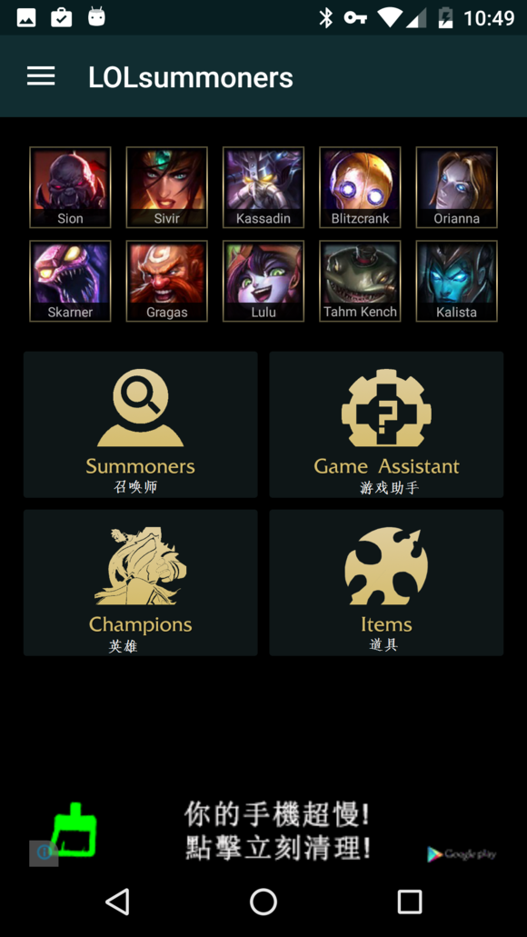 现在由于国服喷子太强大,导致了一批又一批的玩家负气出走外服,韩服、日服、美服、欧服等等都留下了我天朝子弟的身影,小编也不除外,但是平时在国服用惯了盒子的工具,去外服没有盒子,小编瞬间懵逼了......于是乎闲来无事,在谷歌商店找到的一款还不错的类似国服LOL盒子的APP,其实在商店一搜“LOL”,大把的相关APP,不得不说Play商店还是强大,我推荐的这款软件叫做“LOLSummoners for LoL”,直译就叫LOL召唤师吧,,谷歌商店中的截图: