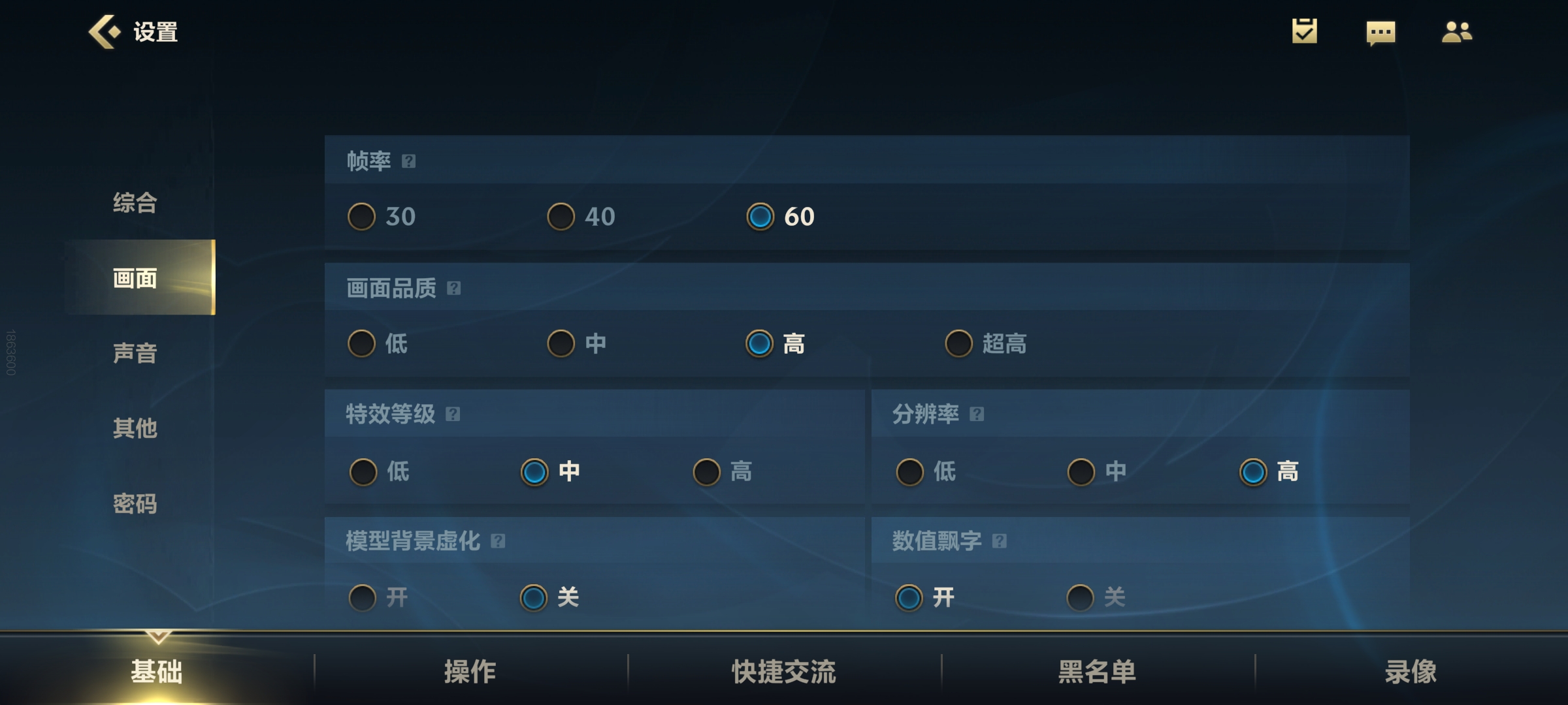 基础设置中着重调节画面。大家可以打开图形设置里的自定义,根据自身手机性能,优先保证帧率(目前最高为60,后续会升级到120帧),其次为特效和分辨率,这三点是影响游戏体验的关键。