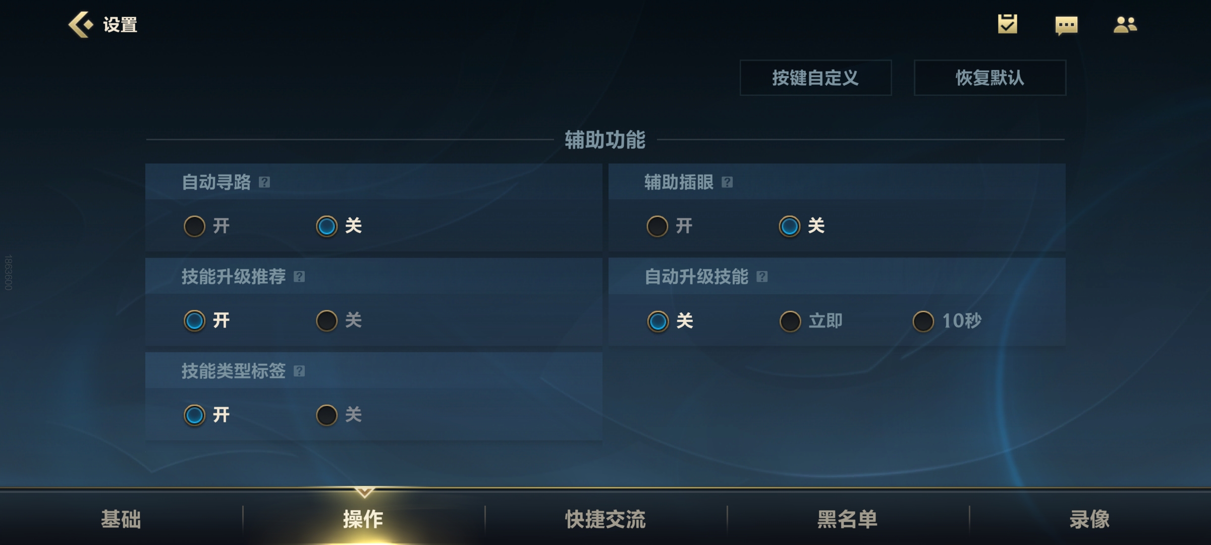 在辅助功能中,建议关闭自动寻路,这样我们用手点击小地图就能直接观察那个位置的情况,而非让英雄移动。