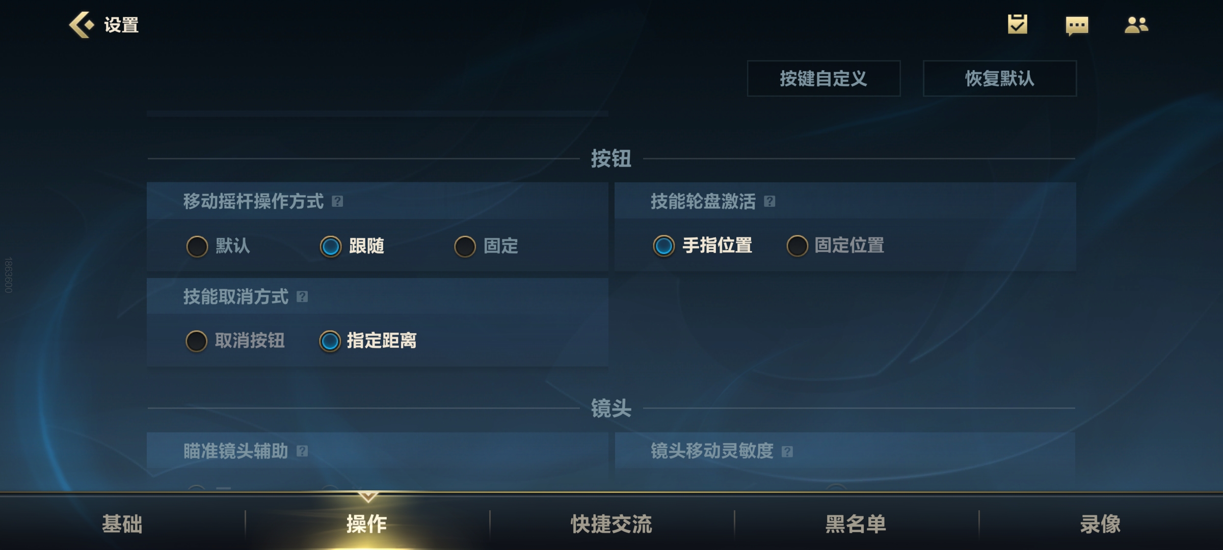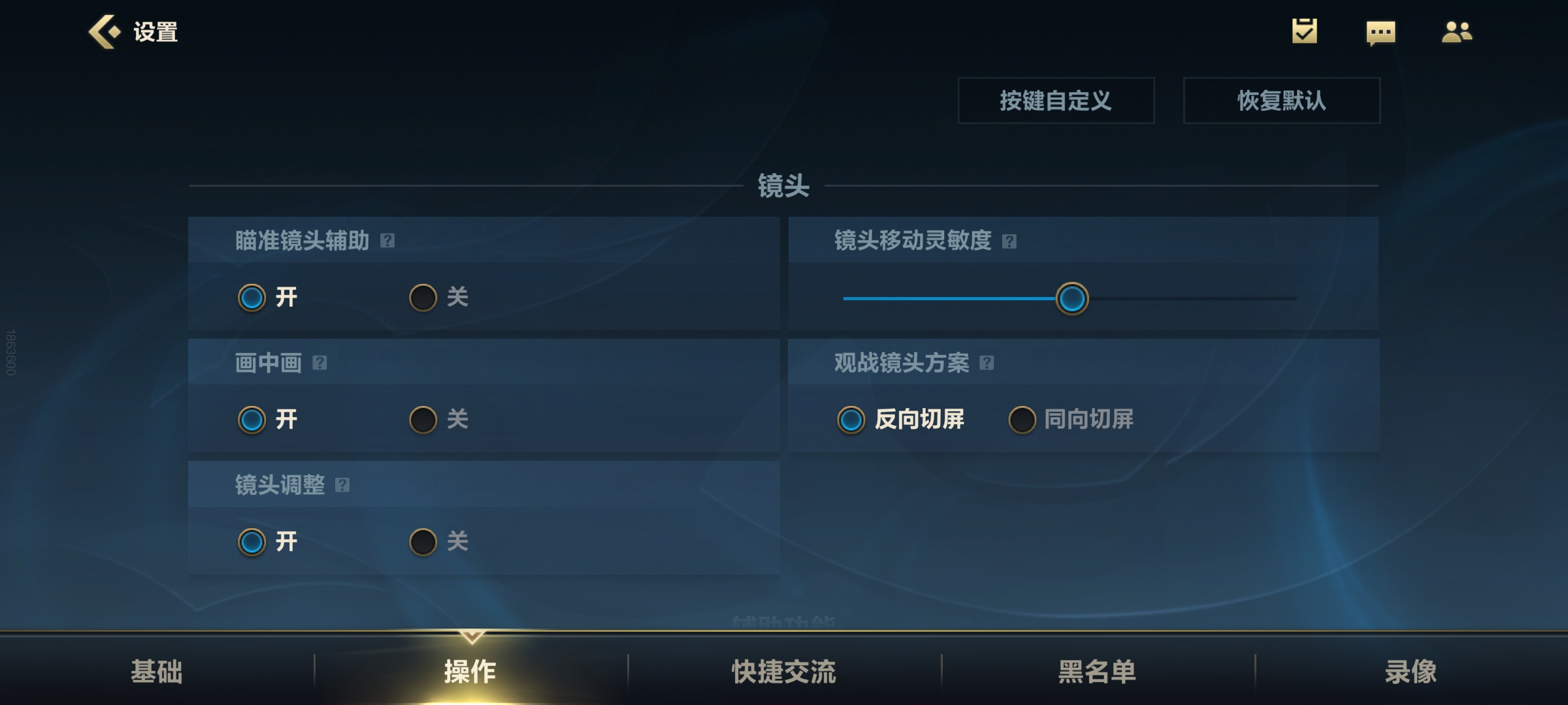 在镜头设置里,必须打开镜头调整,特别在大乱斗模式中,我们经常要拖动视野来观察敌人位置,有了镜头调整,就能固定好视角减少拖屏操作。游戏中如果想恢复原本视角,双击该按键就能还原。