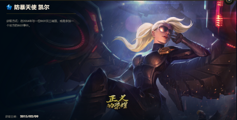 防爆天使皮肤是在2015年2月份官方赠送的,官方奖励在过去一年中,奖励给行为良好的召唤师们,"防暴天使凯尔"限定皮肤成为奖励。这款皮肤非常普及,当时只要没有开挂、挂机、喷人等行为受过处罚的玩家,也就是说保持体育精神的玩家,都会有这款皮肤,但是如果在2015年这个赛季遭受到处罚了,这份正义的荣耀皮肤官方还是会收回去的,天使在重做之后皮肤和原画都换了,新版的天使已经不带头盔了。