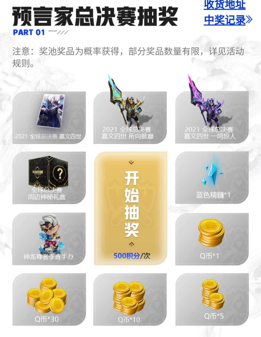 这里的预言家总决赛抽奖我建议大家先不要碰,我自己抽到了1精粹,也有见到抽到3次精粹的,最多见到抽中5q币。(说真的你还不如换成谢谢惠顾呢)