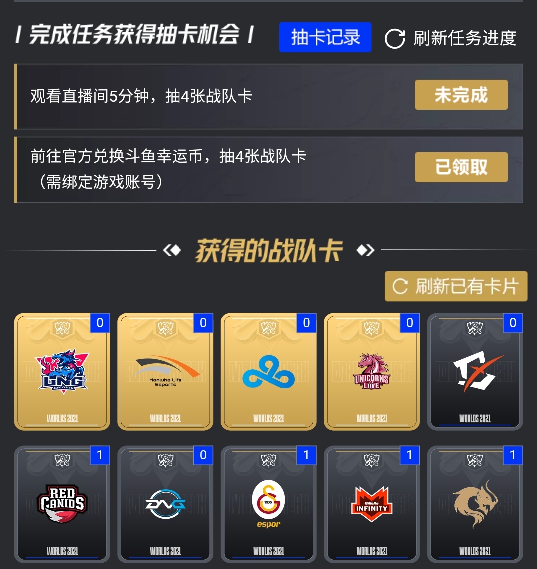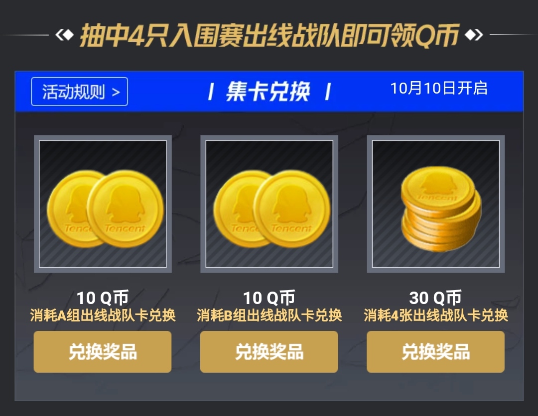 你可以在刚才的预言家活动界面领取幸运币,也可以在直播app领取,观看直播和绑定账号就能抽战队卡,抽中入围赛晋级的队伍就可以领q币,但是货够不够每个人领现在还不知道,到时候能领到我也会告诉大家的。