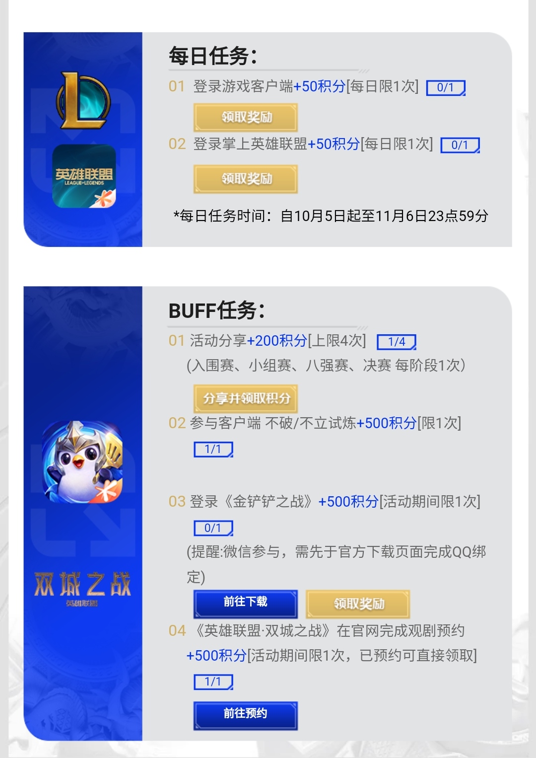 从10月5日起每天登录游戏客户端和掌上英雄联盟都有50积分。分享活动,参与客户端的不破不立试炼以及预约《双城之战》和登录金铲铲也都有500积分。