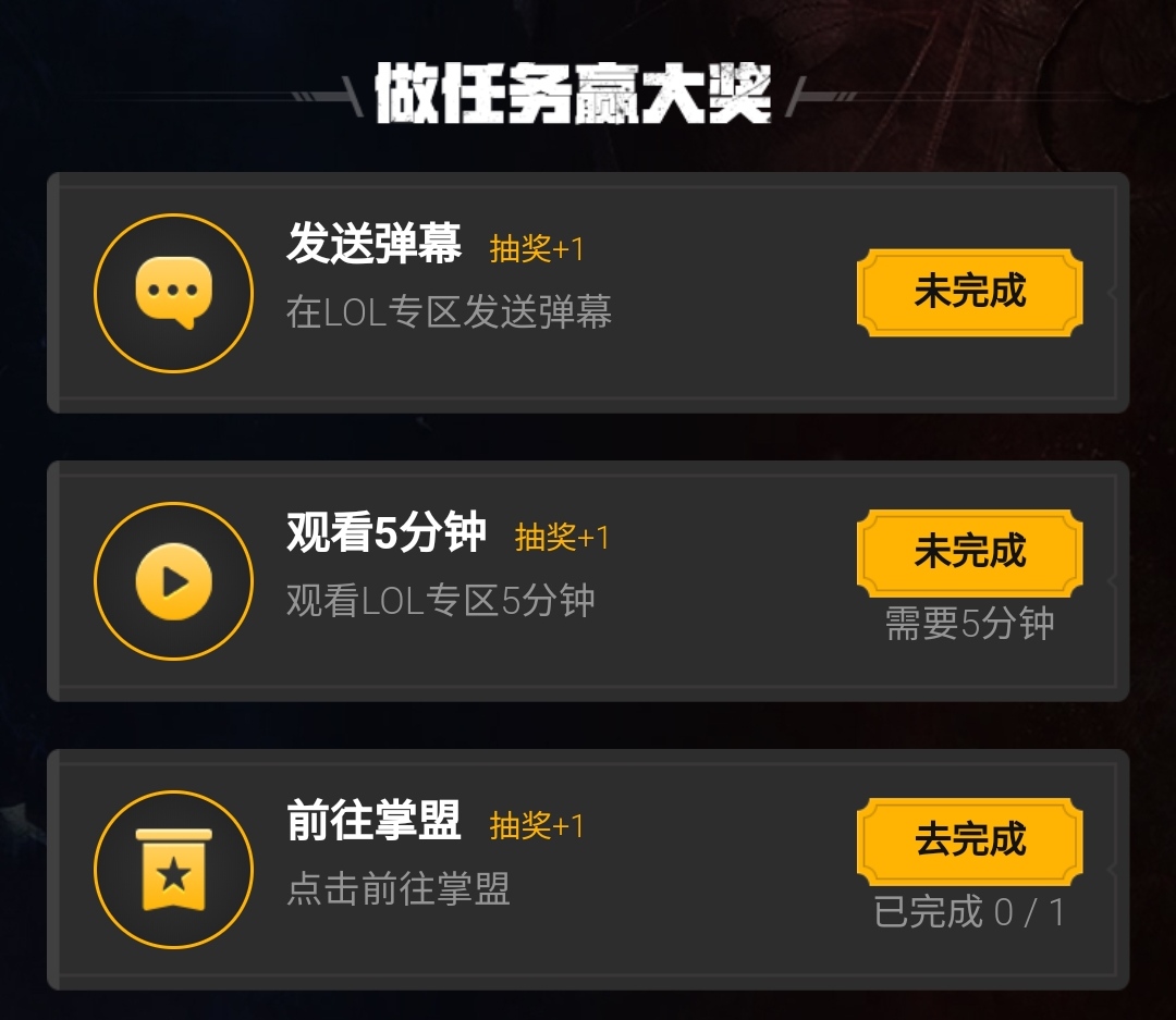 至于任务完成方式还是比较简单,进入掌上英雄联盟,发送弹幕,看五分钟英雄联盟专区主播就能完成。