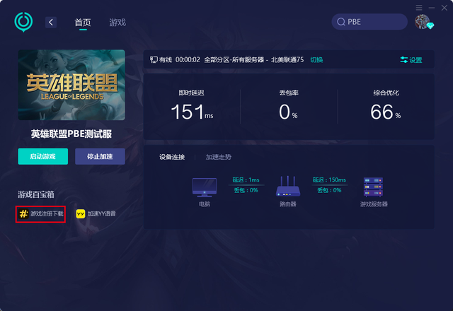 首先打开UU加速器,搜索《英雄联盟PBE测试服》进行加速,然后在游戏百宝箱里点击游戏注册下载,这样就会开始为你下载游戏客户端啦。