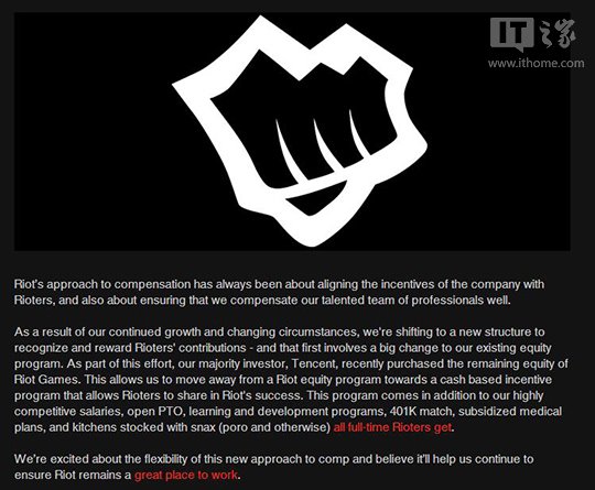 IT之家讯 12月17日消息,日前,《英雄联盟》开发商Riot Games在公司官网宣布,其大股东腾讯收购了公司剩余股份,这就意味着腾讯对这家公司实现了100%控股。Riot公布这个消息的时候,一直在强调,自己仍然是一家值得员工为其效命的公司。
