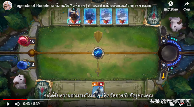好了,接下来我带大家来学习一下这款游戏的模式和出牌流程。首先这款游戏和大多数卡牌游戏一样有玩家血量,在这里我们还是按照英雄联盟里的叫法叫主水晶吧。每个玩家开局后主水晶都有20滴血量,当你没有卡牌抵挡攻击的时候对方卡牌可以直接攻击玩家。或者对方卡牌有贯穿效果的时候,那么在你的卡牌抵挡不住伤害的时候溢出的伤害会计算到玩家的主水晶上。如下图所示,最左边的红蓝水晶上写的16和14代表的就是双方玩家的血量。当血量为0时游戏结束,或者当完成某一卡牌直接胜利的效果时,游戏结束。(比如剑姬,完成剑姬击杀次数可以直接胜利,之后我会专门研究一套关于以剑姬为核心的卡组)