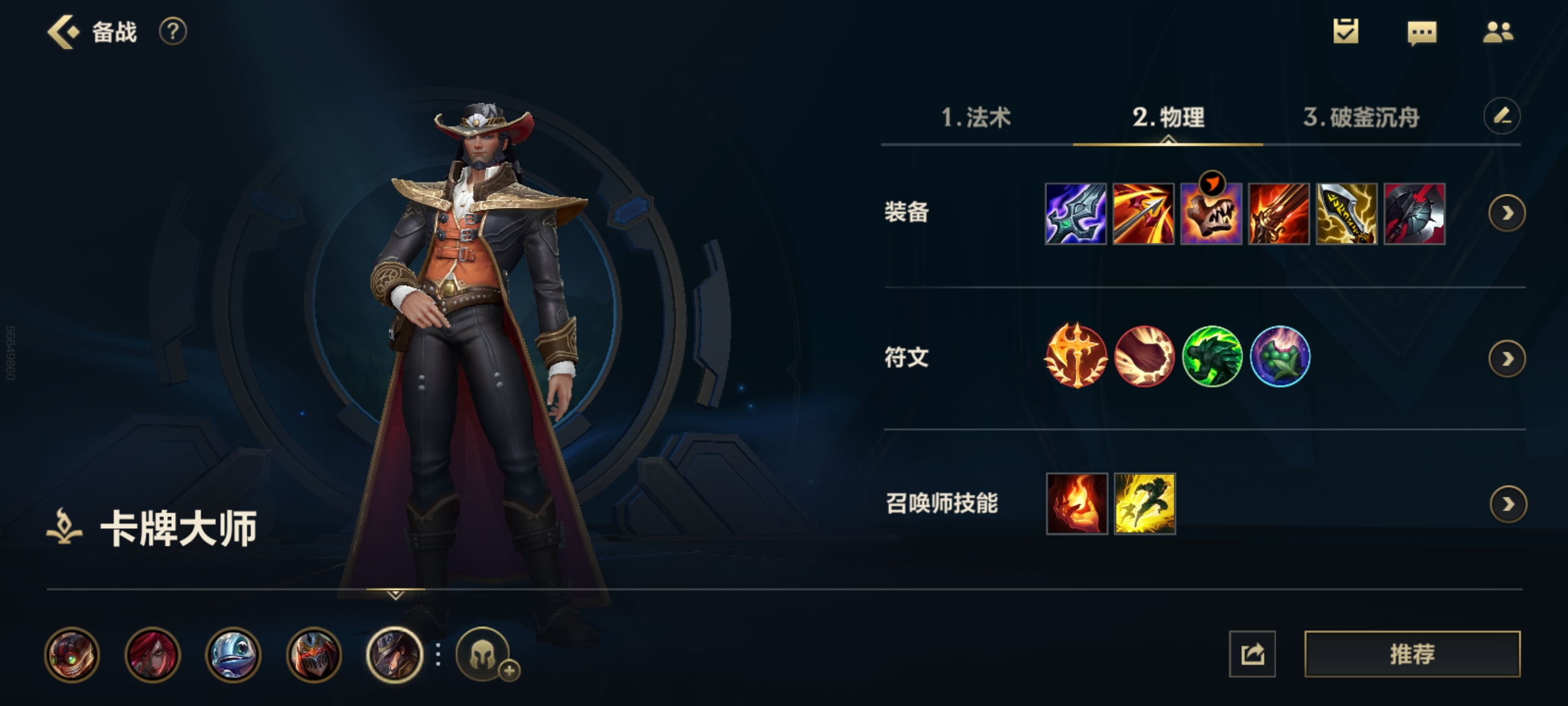 出装分析:卡牌大师在一些特殊情况下可打射手或打野(一主3技能),这时候我们就需要物理出装,在物理出装中第一件一定是破败王者之刃(与卡牌锲合度非常高),3技能开启后,高频率的攻击速度,每次都是百分比伤害,可以很快消耗敌方血线。