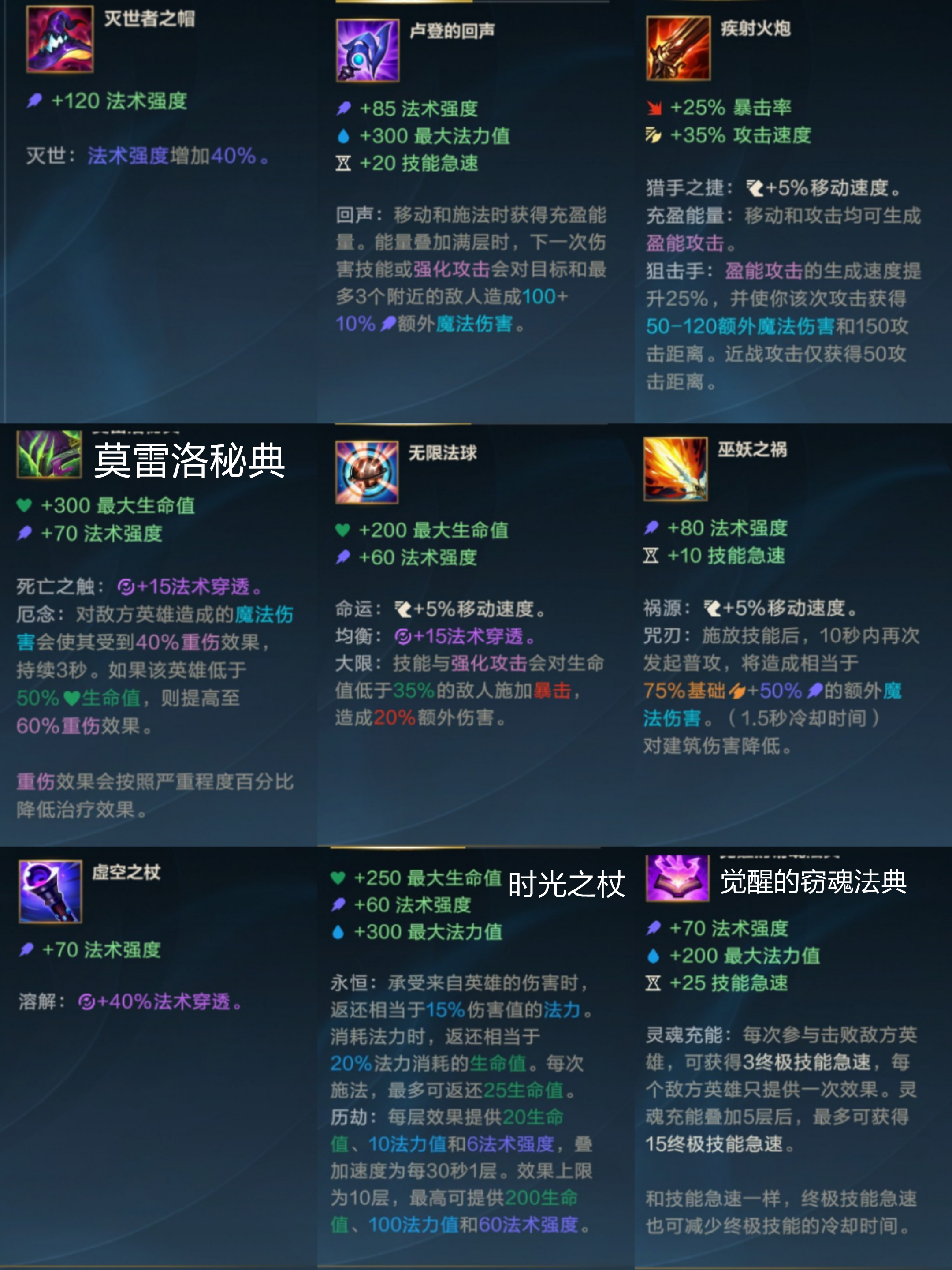 第一套常规出装:时空之杖、巫妖之祸、鞋子、疾射火炮、灭世者之帽、莫雷诺秘典或虚空之杖或无限法球。