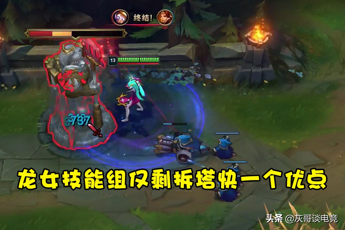 那么问题来了,龙女之前的玩法为何会遭到摒弃呢?从技能组来看,龙女是近战英雄中极少数小技能没有任何控制和保命手段的,且位移能力只有W的一小段加速,走上路会被拉扯麻,玩打野又很难抓到人,即便前期稳住了,团战作用也远不如大部分战士和坦克,唯一能拿得出手的只有拆塔能力了。