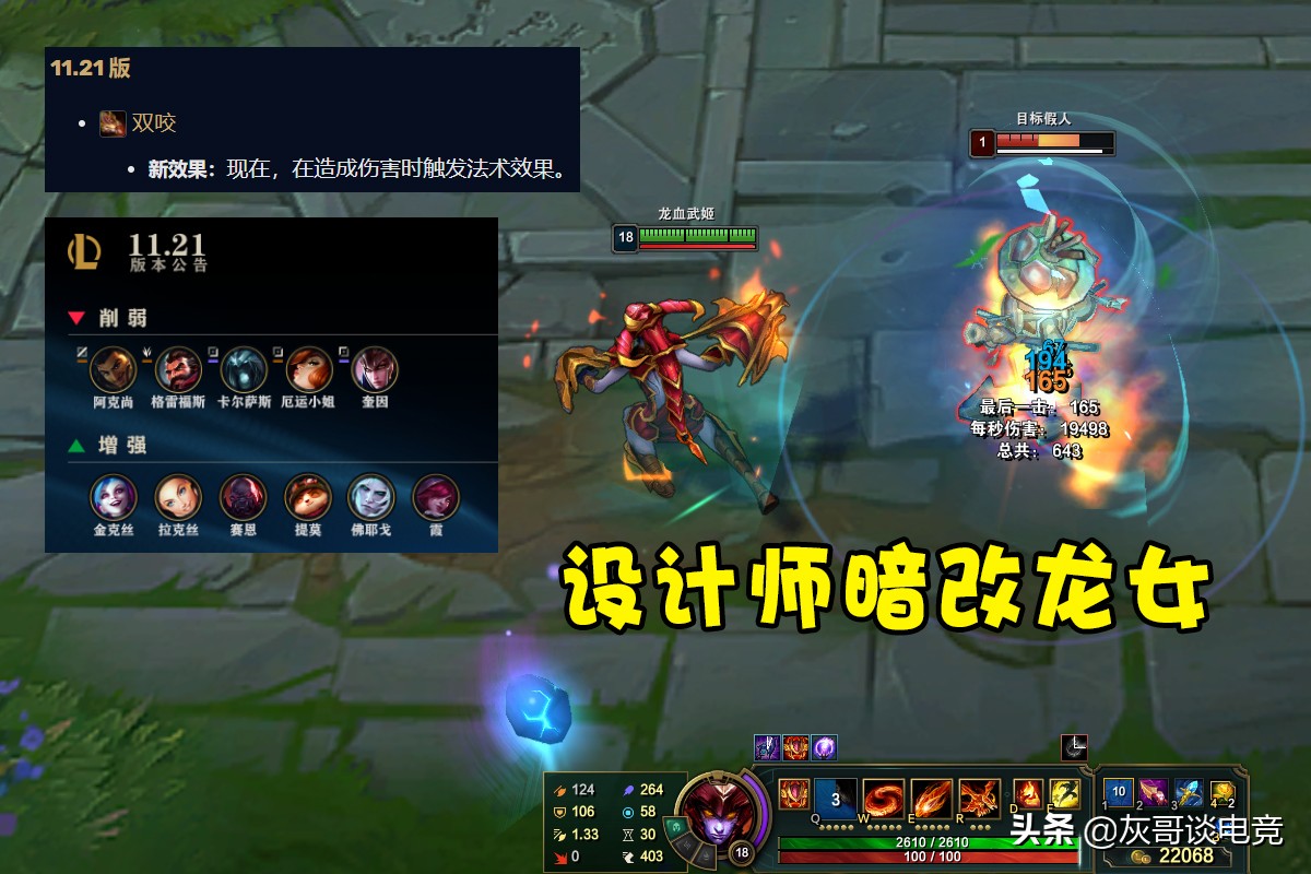 除此之外,还有一次“暗改”,设计师悄咪咪地在11.21版本中给龙女Q技能增加了一个造成伤害会触发法术效果的新机制,像卢登、冰杖、面具、彗星都可以用Q触发了,然而这次加强并没有被写到版本更新中,算是设计师给AP龙女开的小灶吧。