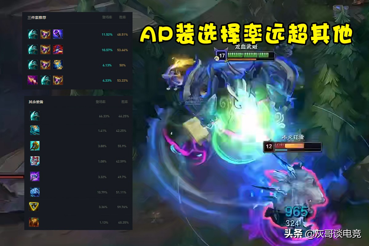 灰哥查了一下韩服龙女场次排名前二绝活哥的数据,他们的玩法都比较传统,要么是出渴血走战士流派、要么是出霜火护手走坦克流派,可两人近五局游戏加起来只赢了一场,战绩更是惨不忍睹,连绝活哥都这样了,普通玩家就更别提了,也难怪设计师会大力推崇AP龙女了,因为出其他装备真的没法玩。