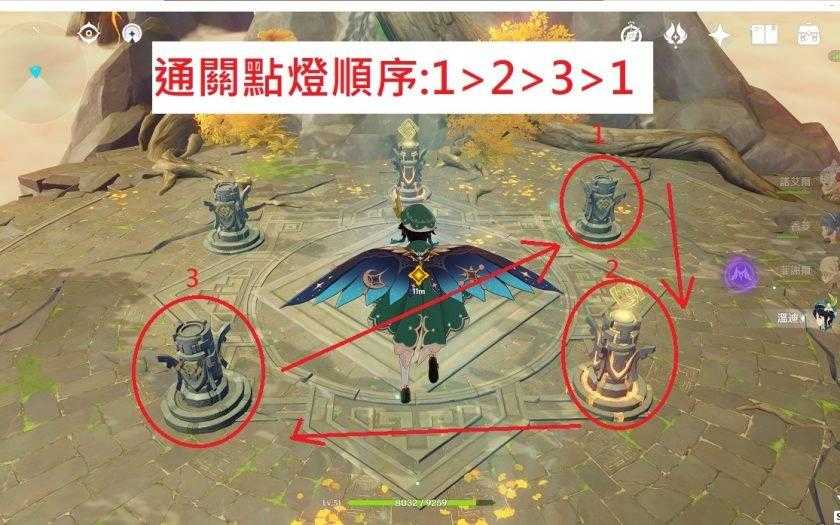 我们先点亮图中标注的1号石柱(遇到其他石柱熄灭是正常现象,不要慌,这里的原理是点亮一个石柱会触发点亮对角线的两个石柱,如果石柱是亮的则会熄灭)。接下来依次点亮2号、3号、1号石柱。这时我们可以看到所有的石柱都会亮起来,并且封印也已经解除了。接下来玩家就可以启动机关,击杀怪物,玩家在完成这个任务之后就会获得一个宝箱。