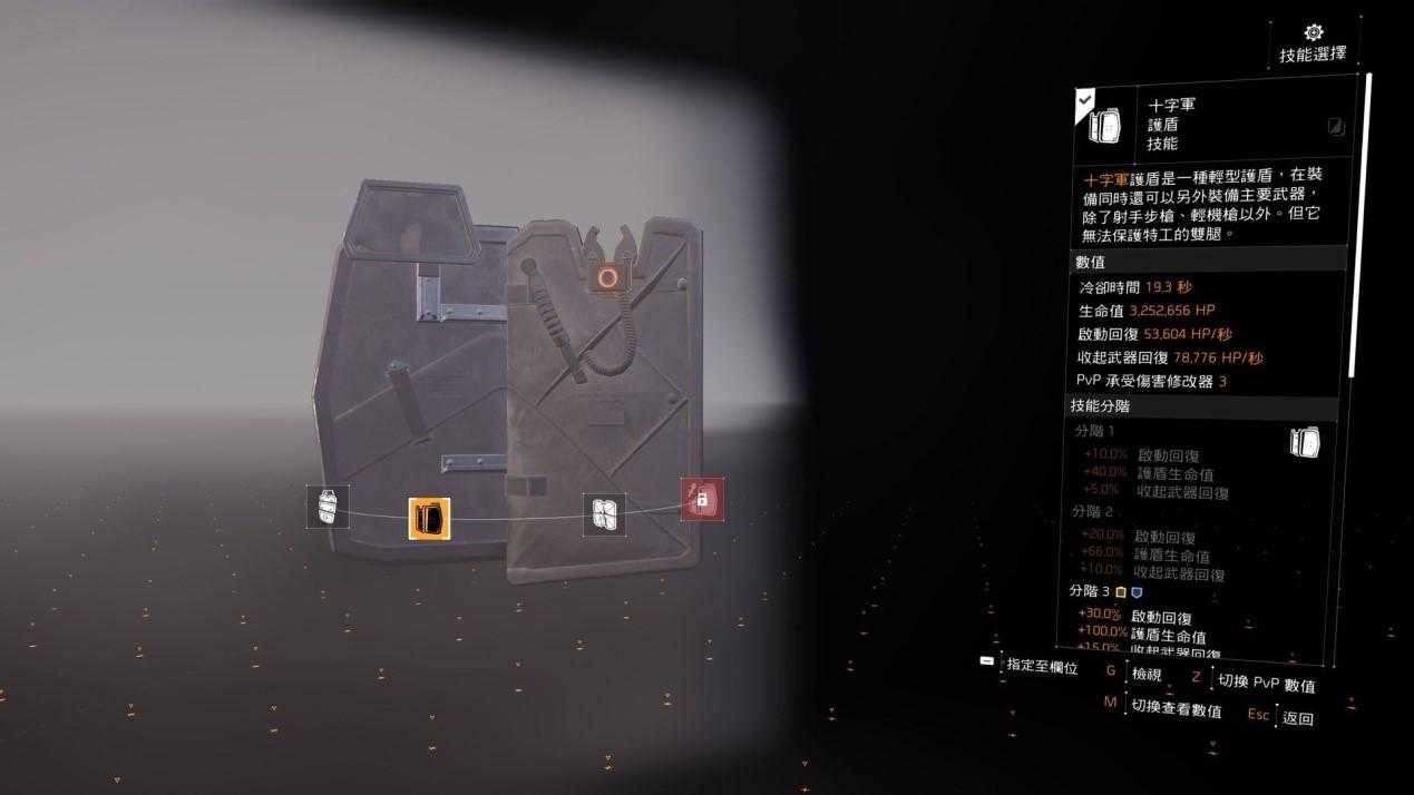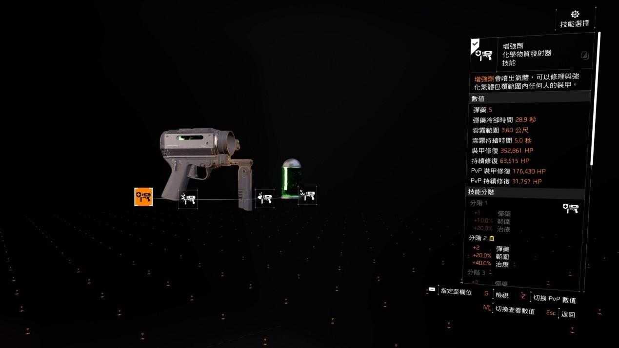 装备:背心天赋:专注(换弹时按右键专注不会中断,推荐)/毁灭性破坏(高机动性) 。背包天赋:警戒(盾受伤不会取消,推荐) /泰然自若 / 震荡(推荐)/安全护卫(偏向辅助)/守护者(偏向防御)。专精:技师(额外1技能阶级)(右下方加点分岐点+10%技能治疗)(推荐)精准射手(+枪械稳定度)生存专家(减少精英伤害)。
