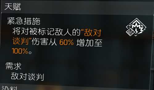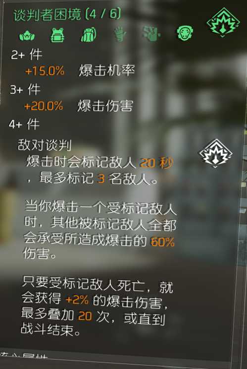 敌对谈判的机制非常优秀,buff触发条件需要对敌人进行一次暴击伤害即可触发,暴击的敌人会被标记,而被标记的敌人会受到造成暴击的60%的伤害,标记的敌人被击败,会增加2%暴伤,最高增加20%。对敌人进行标记,再对另外一个敌人攻击并击败,就会获得暴伤增加,所有被标记的敌人都会受到伤害,而被标记的非受攻击的敌人也会受到伤害。谈判套暴率暴伤决定你的上限,因为暴率暴伤相辅相成,高暴击高暴伤决定你的输出的高低。