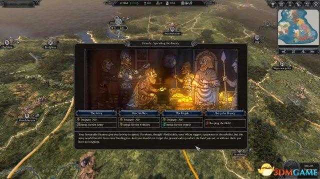 相对于West Seaxe(维赛克斯)的议会机制,Mierce(麦西亚)有着独特的。。。有点难形容。。。就叫扔钱机制吧,当你的钱超过一定数量,好像是五千?就会弹出来一个提示,问你有这么多钱,咋办?你可以把钱撒给军队,享受军事加成,把钱撒给贵族和普通人民也可以,也会享受不同加成。从图中看,一次至少要撒700个金币,如果你选择最后一个选项,留着,那你会受到公共秩序的惩罚,是不是很有意思。