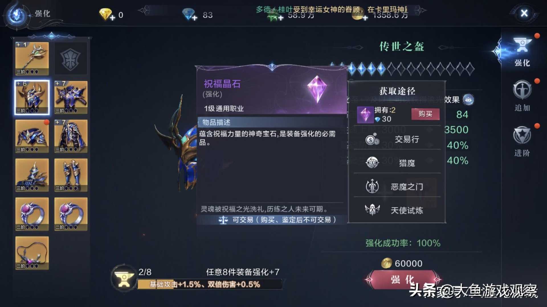 有装备肯定会涉及到强化,奇迹2中关于装备强化个人认为是比较重要的,因为除了强大的属性之外,还给予强化到加7以上的装备特殊外观,而且强化材料获取也不会太简单,强化获取目前有很多种途径,猎魔恶魔之门都可以获取到大量强化石头。
