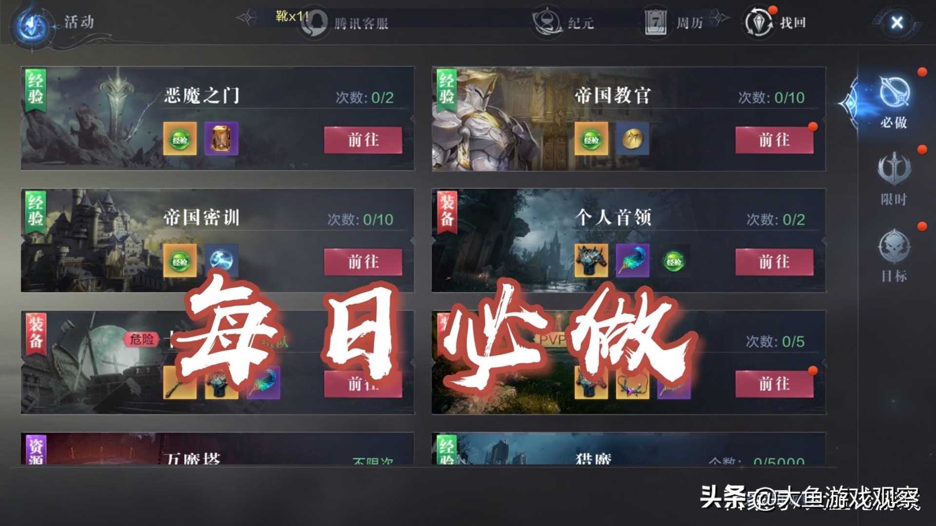 其实右上角活动就是每日必做项目,上门有最直接最根本的日常升级所需要的材料,所以我们在上线,优先完成的也是这个,完成了右上角界面的任务,我们基本上就没有什么做的了。