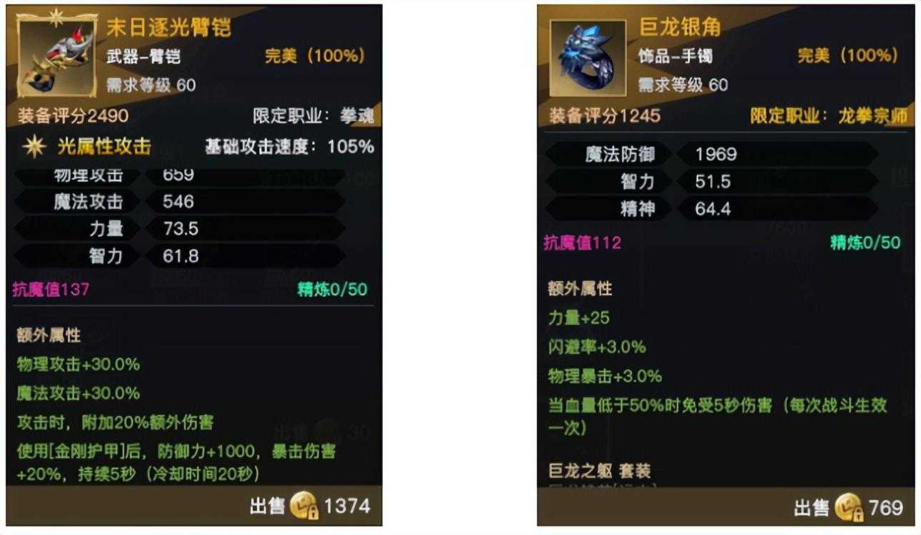 龙巢商店宝箱开出的这个橙武新增了防御特效,十分适合龙拳宗师;职业手镯也可以给龙拳宗师更多的血量保护。