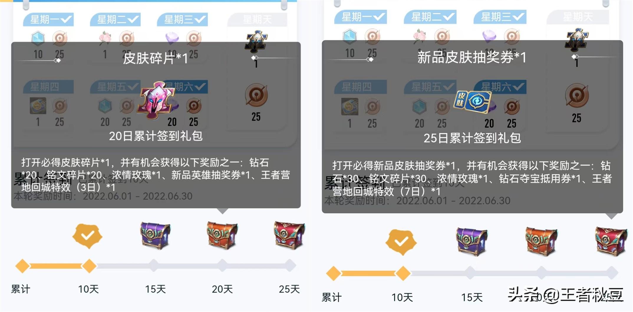 王者营地签到活动中,第20天可以获得1个皮肤碎片。第25天可以获得1张皮肤抽奖券,皮肤抽奖券最差也能抽到1个皮肤,运气好点就2个碎片或皮肤。