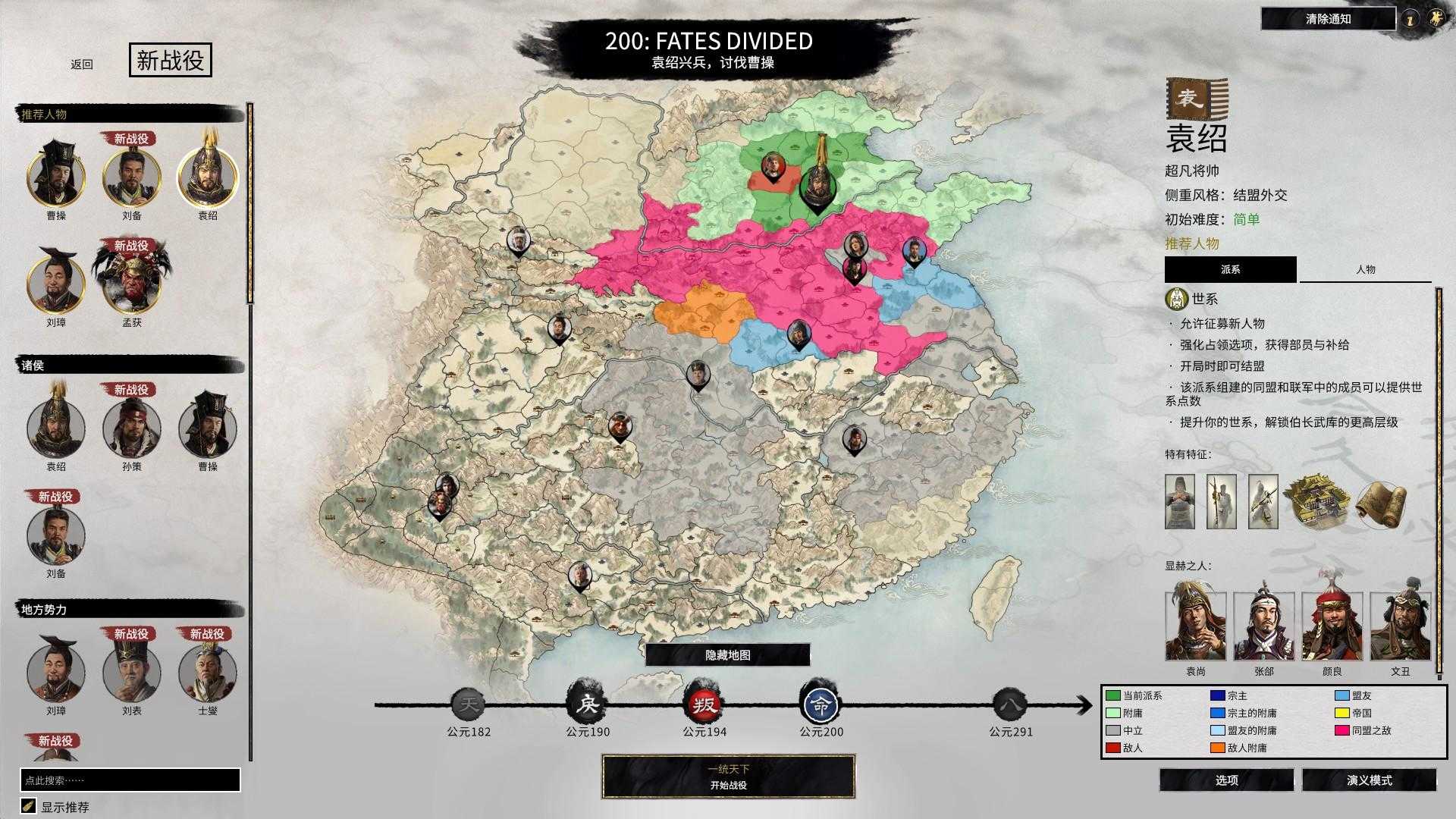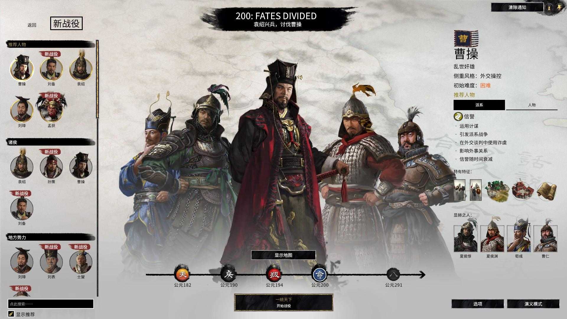 在这次的新DLC“命运分歧”中,CA再次将游戏中心放到了中原,并且将“公元200年”,设计为全新的章节时间点。此时,华北地区,曹操接连击败吕布、袁术等势力,又击退杨奉等人迎回天子,一时风光无限;河北地区,袁绍击破强敌公孙瓒,占领幽州。其长子袁谭又以实力驱赶了盘踞北海的孔融,接管了青州的大部分领地。一边是“挟天子以令诸侯”的曹操,另一边是手握青、幽、并、冀四州的袁绍,两者以黄河为界,态势一度紧张,战争一触即发。