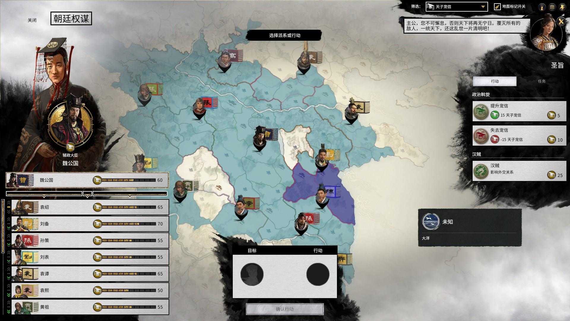 新加的“朝廷权谋”,则引进了全新的概率“天子宠幸”,使得汉献帝不再只是一个吉祥物。这个想法还是挺好的,在很多三国题材的游戏里,汉献帝可以说是最有NPC特点的NPC了。其作为大汉王朝的标志,最后也把自己活成了一个标志。但在这次的DLC中,汉献帝摇身一变成为类似十字军“教皇”的存在,天子宠幸较高的派系,能获得一些有益的加成;宠幸低的派系,不仅会产生Debuff,更有可能会被直接打上“汉贼”的标签。这也是开局曹操“挟天子以令诸侯”的优势之一。控制皇帝的曹操可以花费自己的宠幸点数,指定别的势力为“汉贼”,让忠汉势力对其群起而攻之。
