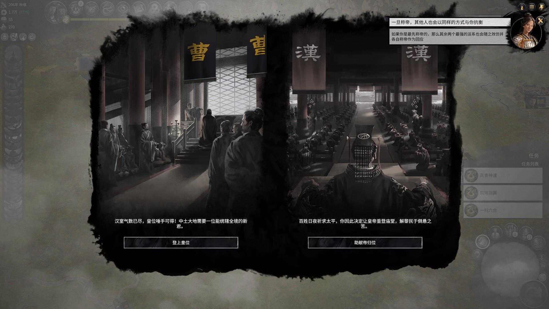 更有趣的是,当掌控天子的势力,达成称帝的条件后,可以选择将权力“奉还汉室”。若选择这种,派系领袖会变成献帝,玩家就能真正实现“匡扶汉室”的梦想。