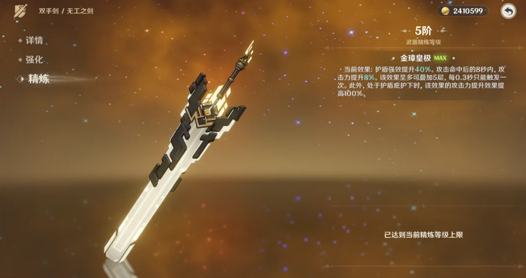 在原神中无工之剑虽然是把5星武器,但比较尴尬的效果触发条件使得它的地位并不高,通常会跟一些热门武器捆绑在一起放入up武器池中,例如2.6版本下半场的武器卡池。