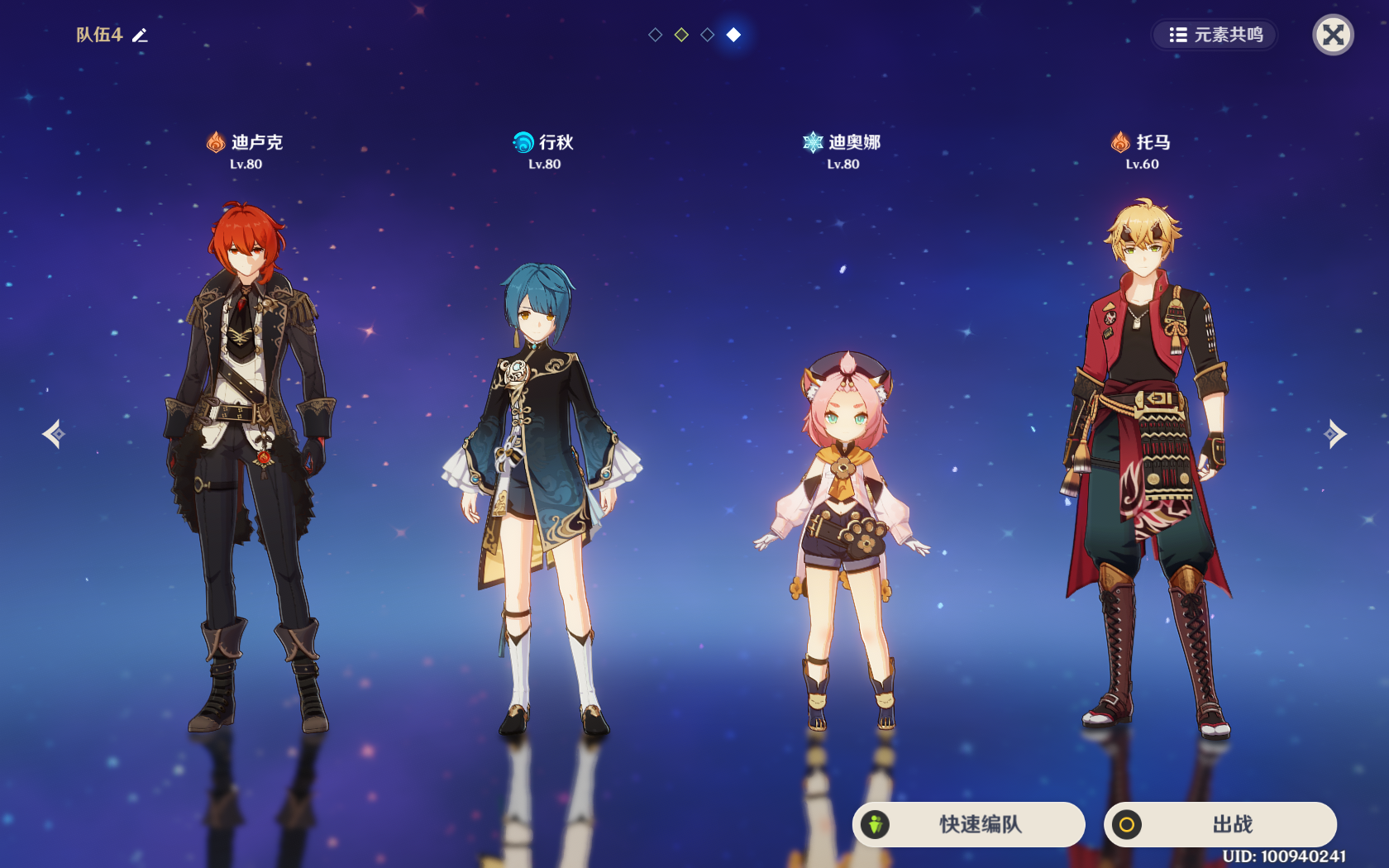 双火用来进一步提升攻击,迪奥娜负责奶以及冰元素领域,行秋自然配合迪卢克打蒸发了,截止2.6版本,行秋也可以换成神里绫人。