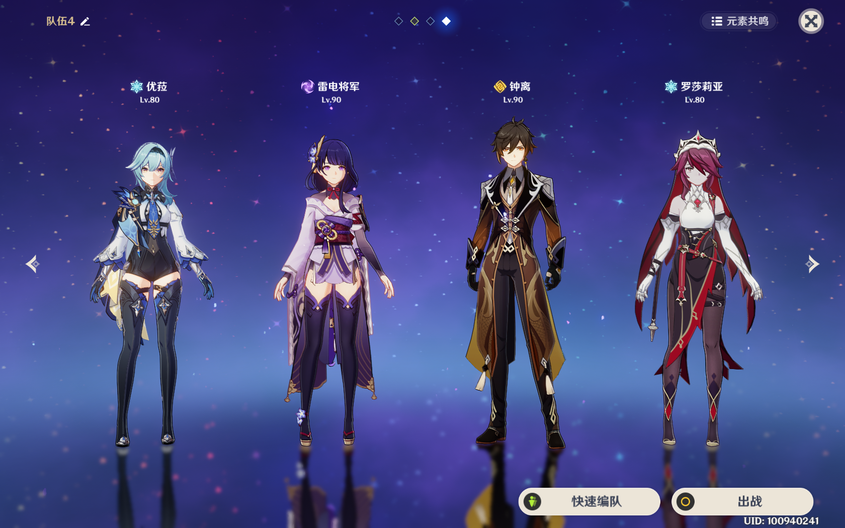 这个队伍至少需要双冰,除了有暴击加成以外,对优菈的充能也有很大帮助,优菈非常吃大招。这个队伍中如果是钟离的话,无工比较容易吃满buff,而迪奥娜盾比较脆,需要一定操作。