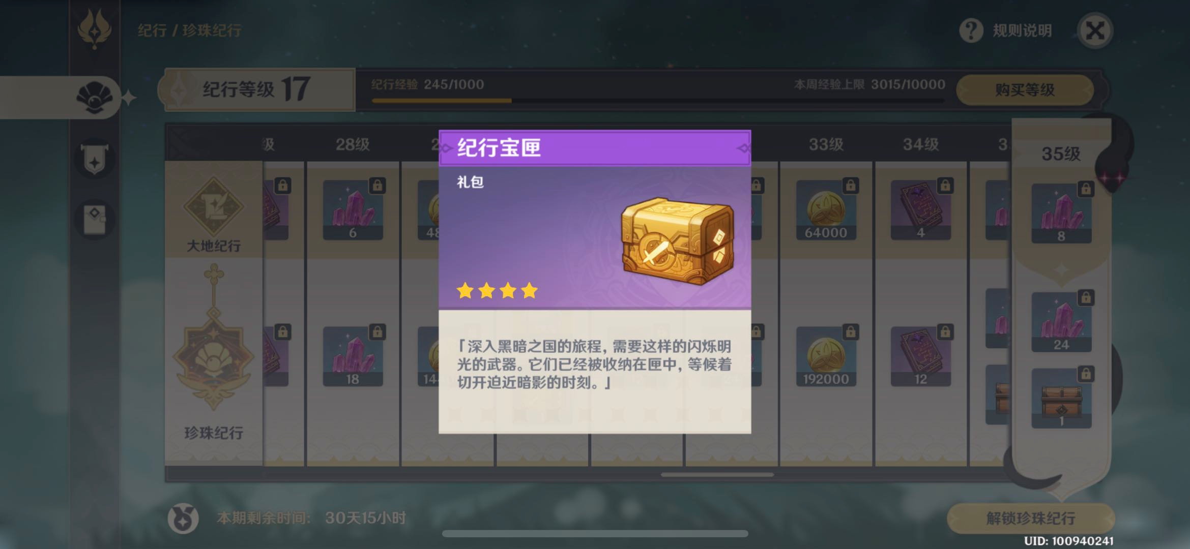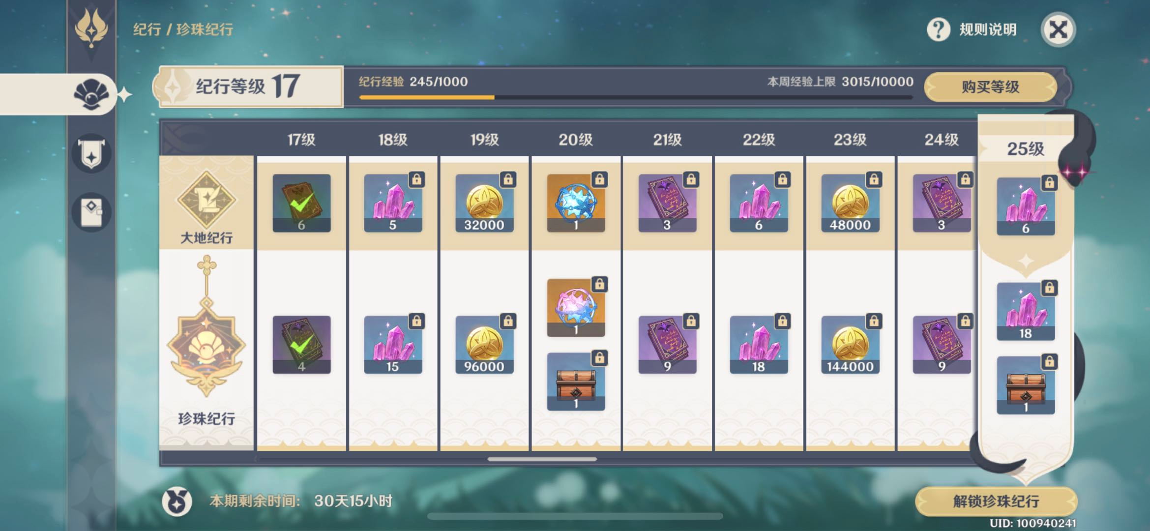 目前珍珠纪行共为50级,每升一级都需要耗费1000点的经验,合计需要5万经验才能满级。每一级都有丰厚的奖励。(有经验,摩拉,武器经验石,天赋技能书,武器,原石等等)旅行者通过完成固定的任务来获得其需要的经验。一期纪行的时间为56天。