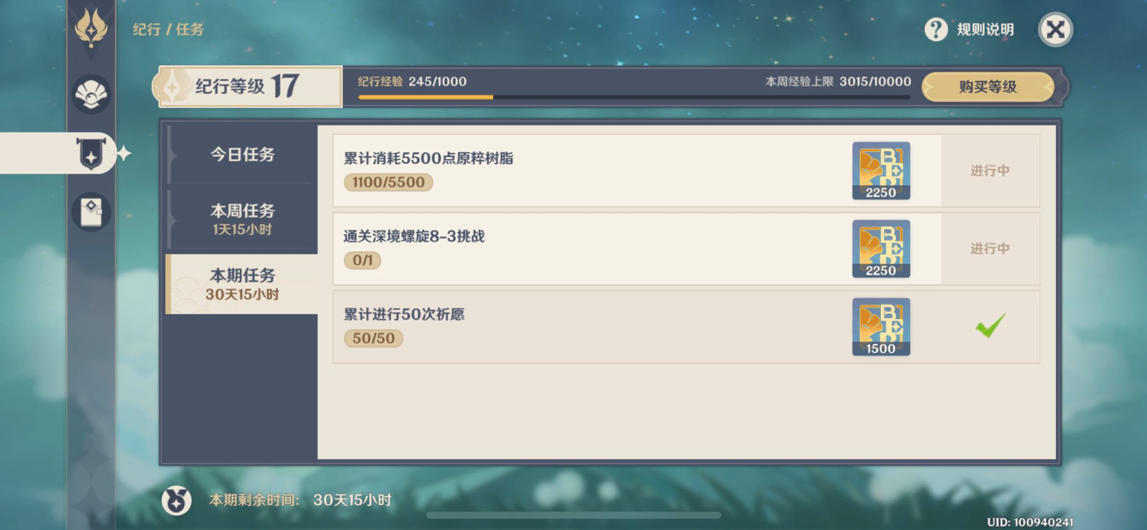 ps时间到!每周任务里有个“累计消耗1600点原粹树脂”的存在,而每周自然恢复的树脂最多也就1000出头,所以在完全不消耗原石购买或脆弱树脂补充的情况下,这任务是难以完成的。所以请酌情处理,当然时间依然很宽裕。