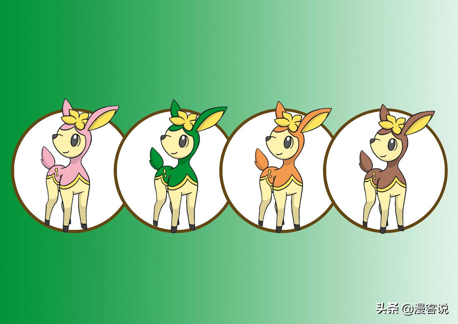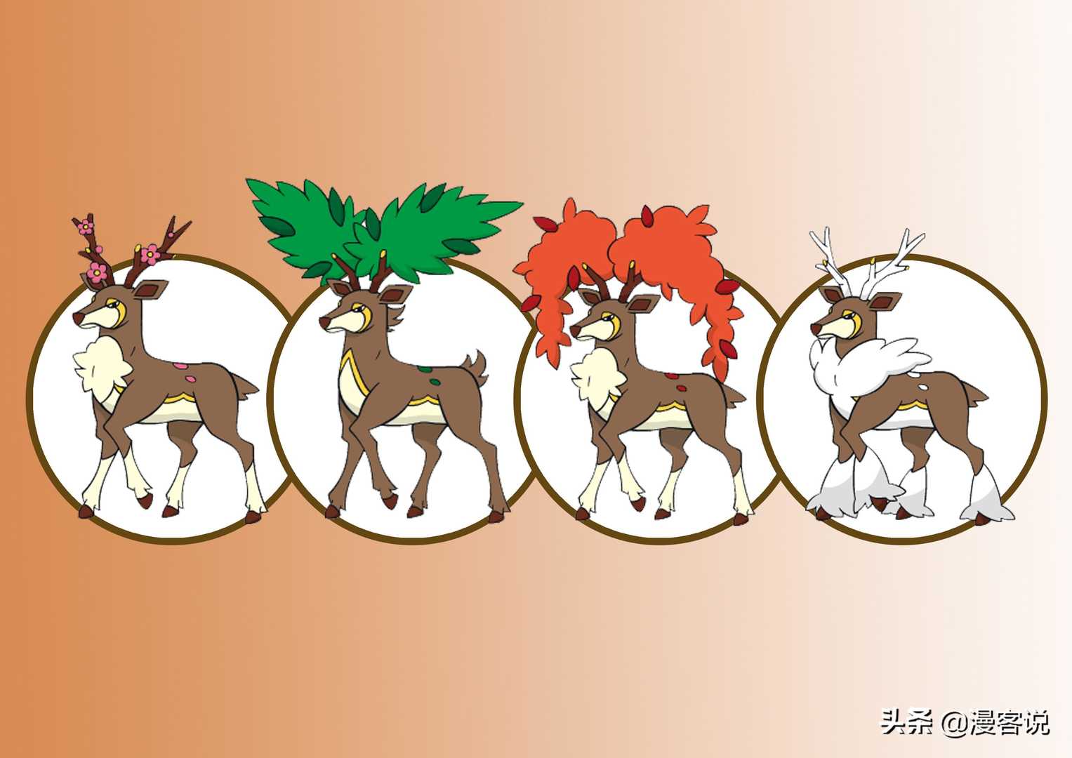四季鹿,一般属性和草属性宝可梦。四季鹿拥有根据气温及适度改变颜色的毛皮,所以根据季节不同而改变样貌,因而四季鹿有着春夏秋冬四种不同形态。
