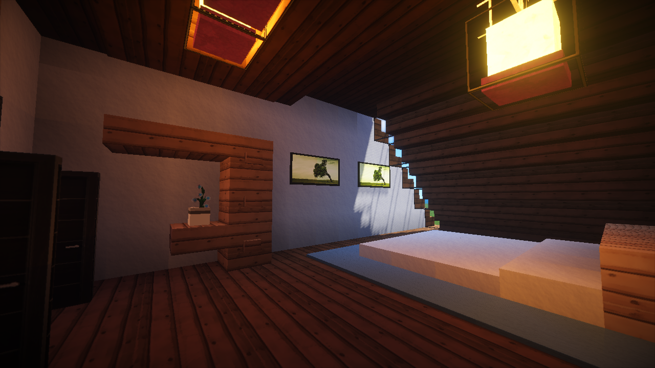 这里显示了更全面的卧室的床的部分,左边用木头做了个小小的装饰架。