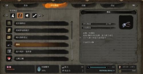 【鲜柿子】:前往【仙峰寺】,从该区域第一个鬼佛的出口的右边跳下去,那里可以看到风筝和一个矮子怪。使用【傀儡术】(仙峰寺剧情杀4猴给)矮子怪便会去操纵风筝,传送到【修炼道】往回走,会看到一颗大树,到树的末端用钩绳勾住风筝到一个平台,继续往右下方跳入,下落途中注意使用钩绳,到达【坠落之谷】的【裂缝洞穴】鬼佛处,一直往前走到悬崖处往下看可以看到【白蛇】盘踞在下方的山顶,跳下去忍杀【白蛇】即可获得【鲜柿子】。