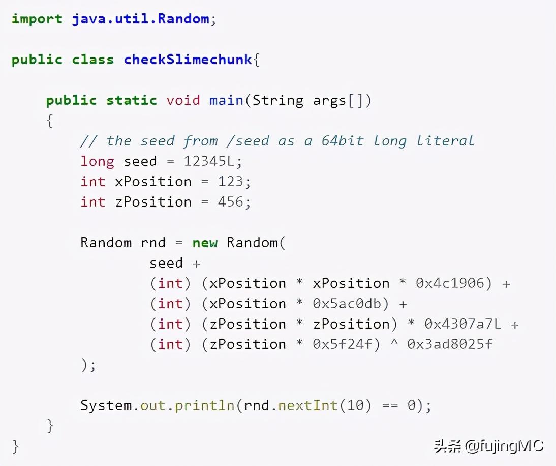 在Java版中,“史莱姆区块”的决定是由世界种子和区块坐标结合起来的伪随机而成的: