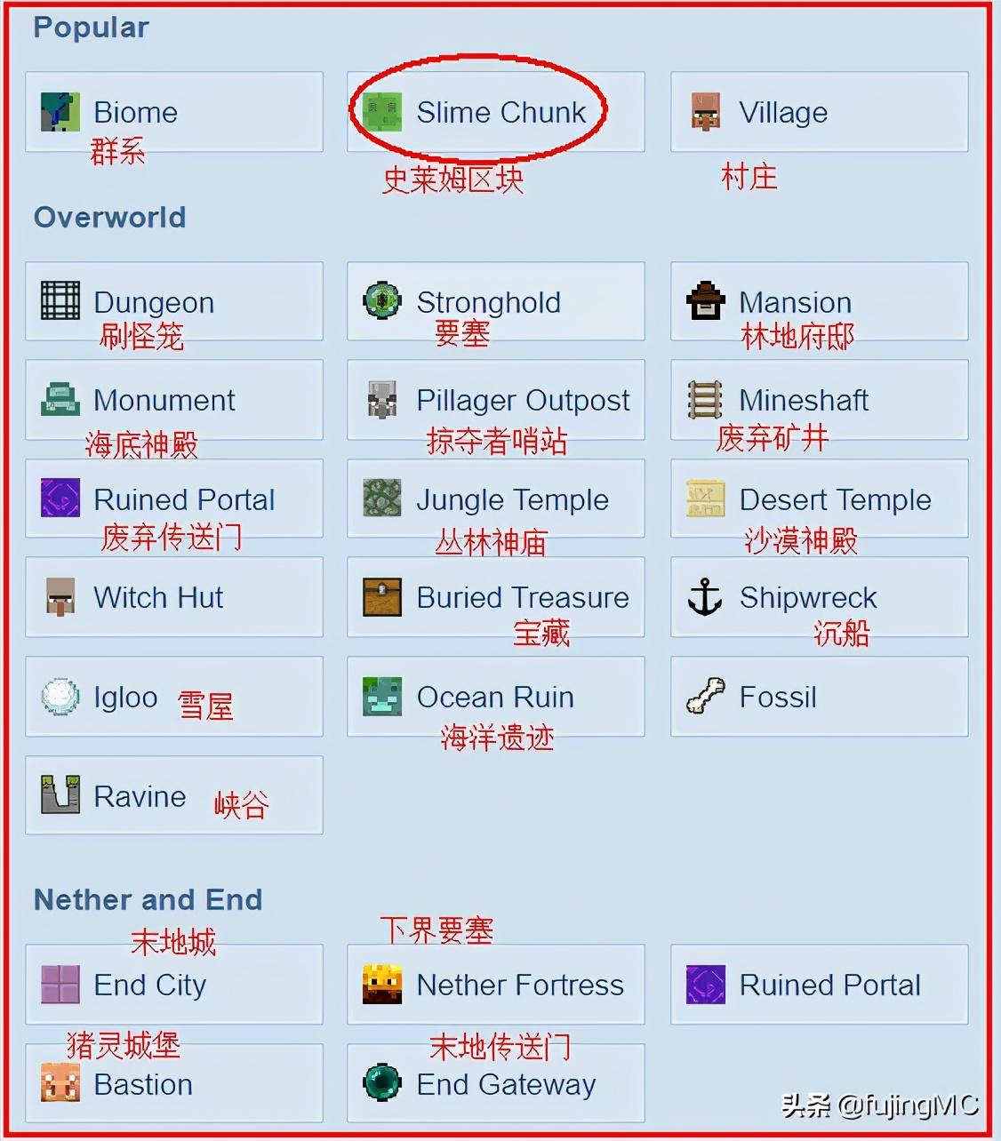进入后我们会发现,此网站不光可以寻找史莱姆区块的坐标,还可以寻找生态群系,村庄,海底神殿,沙漠神殿,丛林神庙,林地府邸,掠夺者哨站,刷怪笼,要塞,下界要塞,末地城,猪灵城堡,沉船,雪屋,废弃矿井,废弃传送门等等。