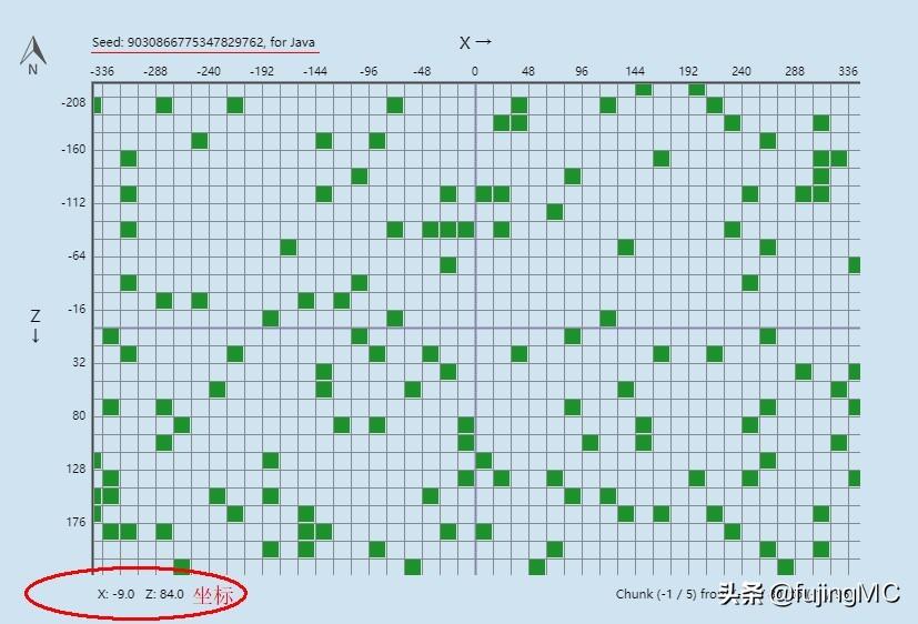 下方会显示出史莱姆区块(绿色)左下角有对应的坐标。我们就选一两个离我们最近的区块建史莱姆农场就好了。