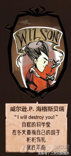 作爲一名"科学家",威尔逊其实没可以展现他的天赋。更确切地说,他代表的,更像是一切20岁-30岁的普通男青年。无论是体能、头脑、抗压才干都较爲均衡的威尔逊,在《饥馑合辑版》的世界中,表现出了一个正常人类该有的一切:在危难到来时努力拼搏,在黑暗中惧怕孤独,在炎热或冰冷时想尽一切办法熬过苦痛。这样的设定,也使他成爲了游戏中默许的第一位主角。