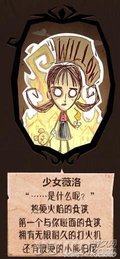 作爲一位随时可以肉体失控的少女,薇洛同时也是《饥馑合辑版》中解锁的第一位女性角色,自带一个无限耐久度的打火机。由于火灾,她在14岁时失掉了自己的亲人,更能免疫火烧的困扰。而这也使得她变爲了一个爱随意放火的肉体病患者,你甚至经常能在耳机中听到她的嘀咕"是什麼呢?"因此,玩家在运用薇洛时,需求在初期就留意她的肉体值,同时晚上要尽量避免在森林营地过夜。