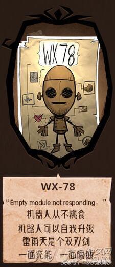 幽默的是,《饥馑合辑版》中不只要伟大人类,还有WX-78这位机器人的特殊存在。当一个没有灵魂的生物体遭遇末日,WX-78可以吃下任何腐败的食物而不会减血。WX-78还能食用齿轮,提升生命力与明智。不过,钢铁制造的生命体异常有致命的弱点,那便是会被雨水腐蚀而损失生命,所以切勿遗忘爲他制造一把雨伞;当遭到雨水损坏时,他会活期发出光(发作火花),从而在黑夜中避免一定的损害。
