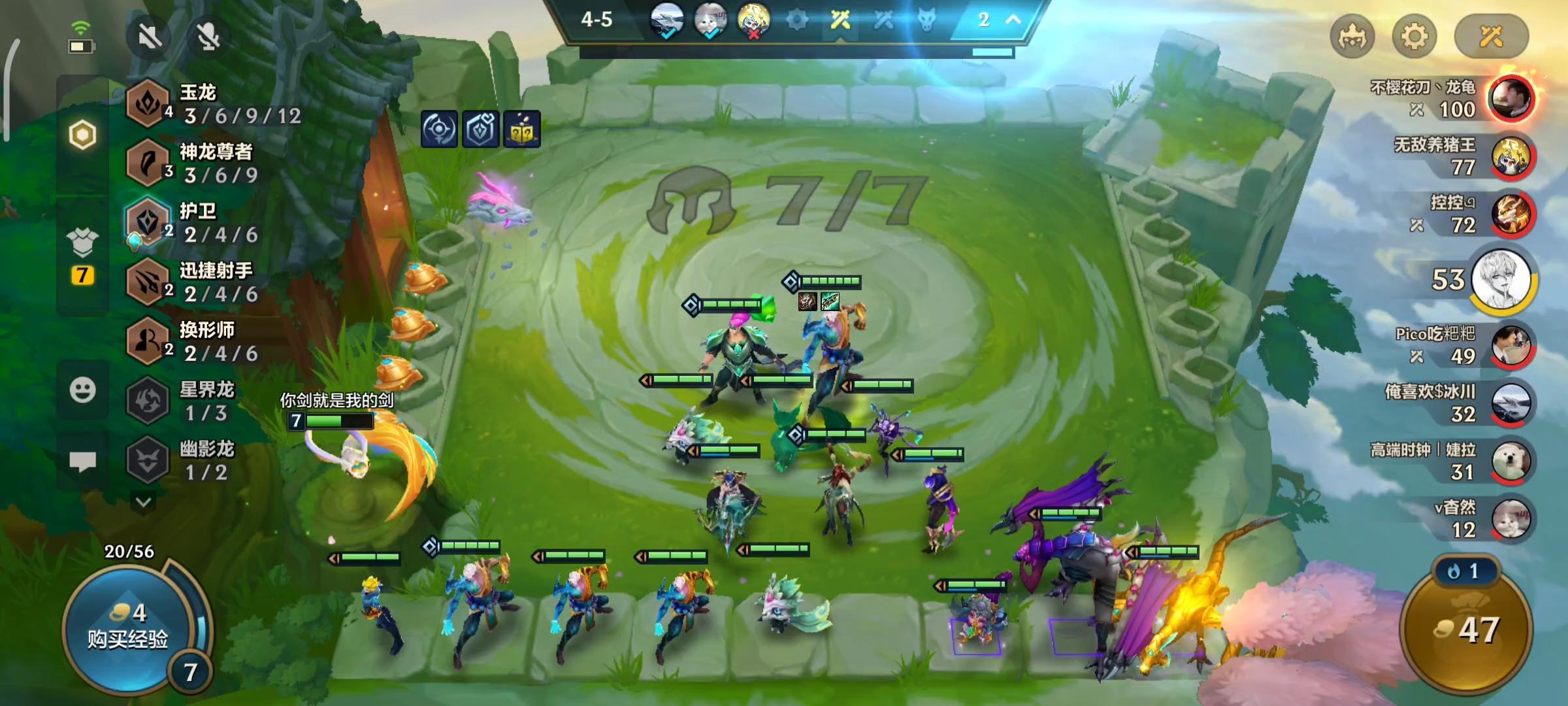 玉龙中的卡尔玛、塔里克、艾希都是比较容易刷到的,所以凑齐3来龙并不难。到四人口的时候,上一个蕾欧娜,搭配3玉龙+2护卫。由于艾希和卡尔玛都有神龙尊者的羁绊,因此,到了五人口之后,还可以上一个瑟提、李青或者是斯维因,搭配3神龙尊者的羁绊。