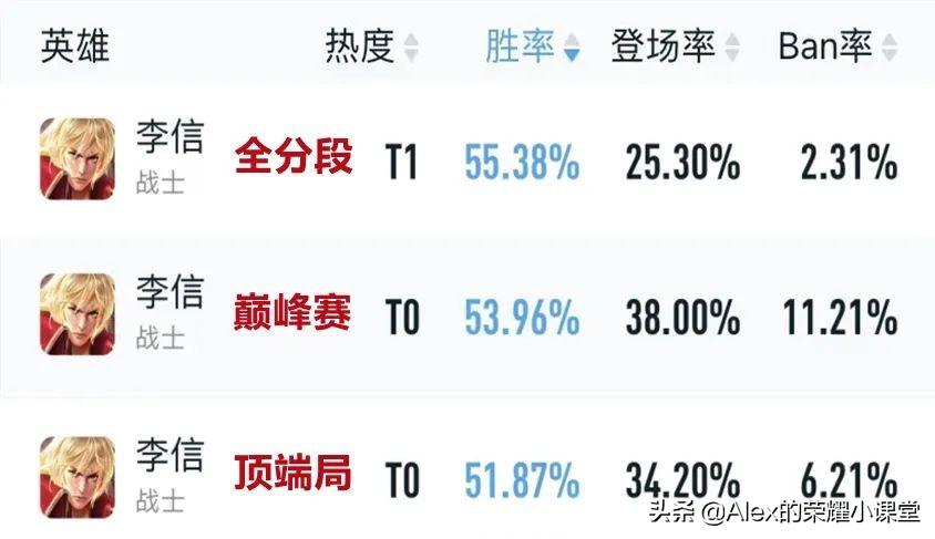 目前李信的全分段排位胜率55.38%、登顶全英雄第一,巅峰赛出场率达到38%的同时,胜率高达53.96%。